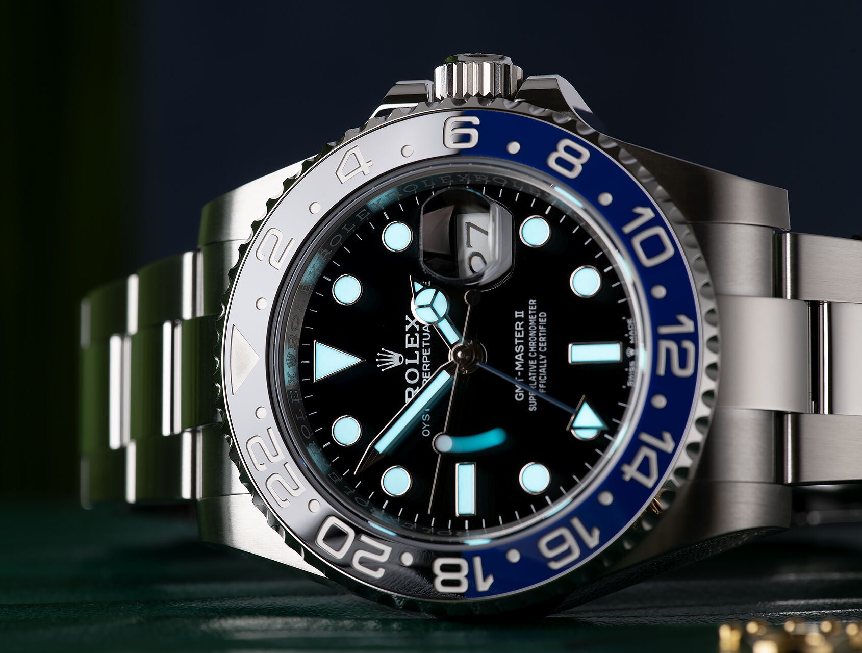 Distinguished by its blue & black Cerachrom bezel with blue 24hr hand. Fitted to the sporty stainless steel Oyster bracelet with Easylink adjustment, powered by Rolex dual-time Calibre 3285, with improved 70-hr power reserve. Waterproof to 100m.