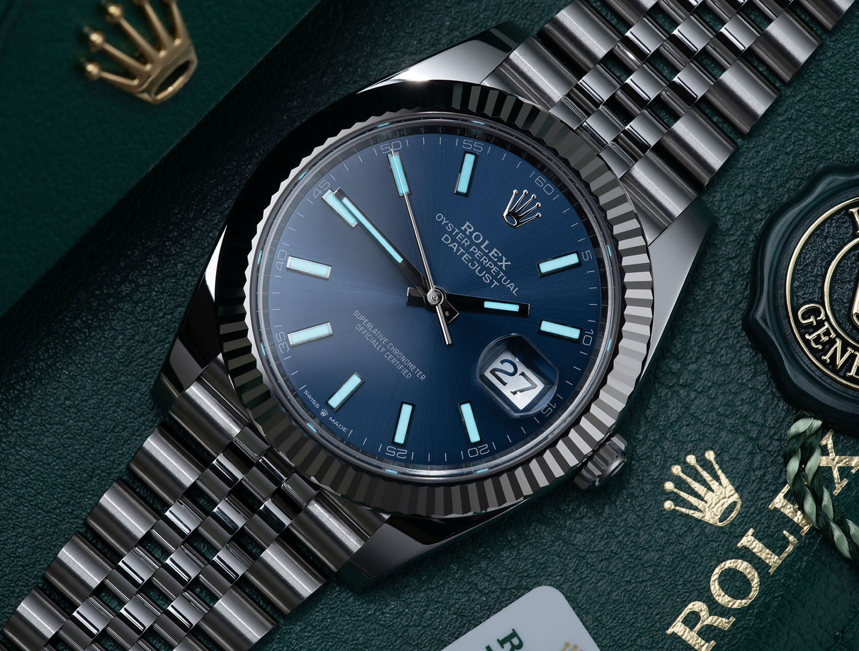 This is the 41mm steel Datejust ref. 126334 with beautiful blue baton dial, 18ct white gold fluted bezel and Jubilee bracelet. Powered by Rolex’s upgraded self-winding calibre 3235 with improved 70hr power reserve, waterproof to 100m.