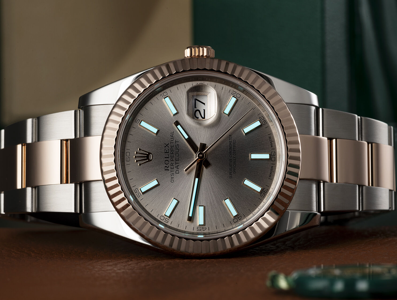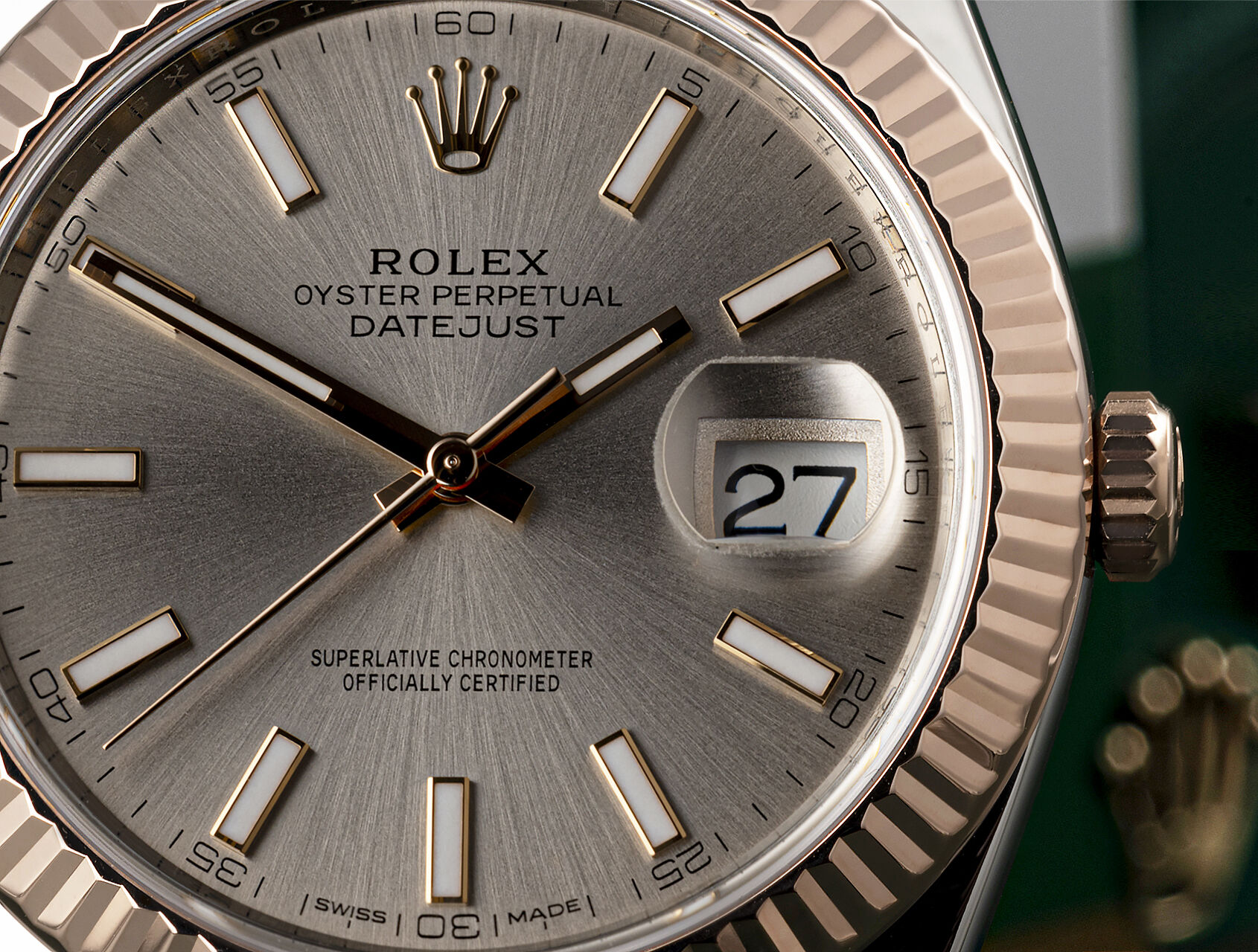This latest Datejust 41 (126331) in beautiful steel & Everose gold is our first example with the attractive brushed Sundust dial, and it looks superb. It features Rolex’s iconic 18ct rose gold Fluted bezel and Oyster bracelet, with 5mm Easylink adjustment. Waterproof to 100m, it’s powered by Rolex self-winding calibre 3235, with improved 70-hr power reserve.