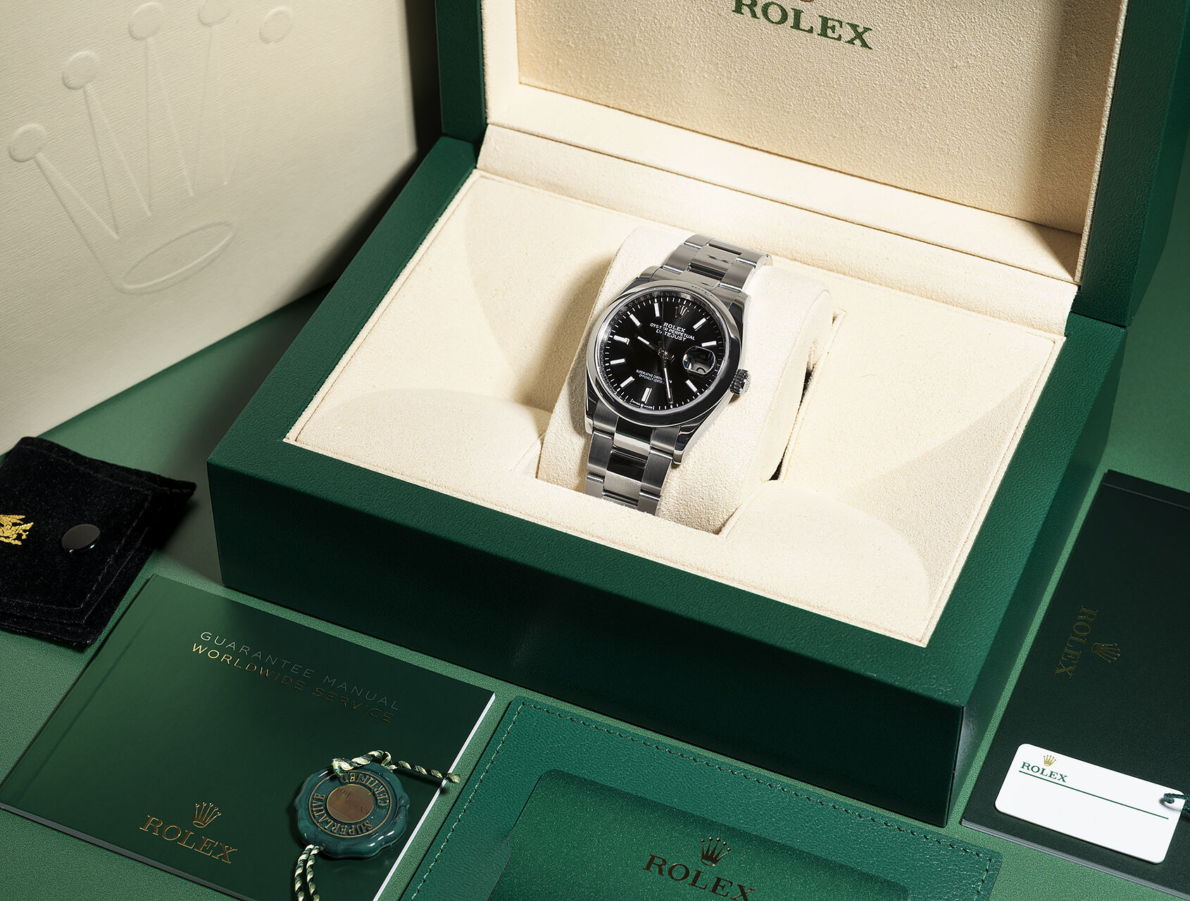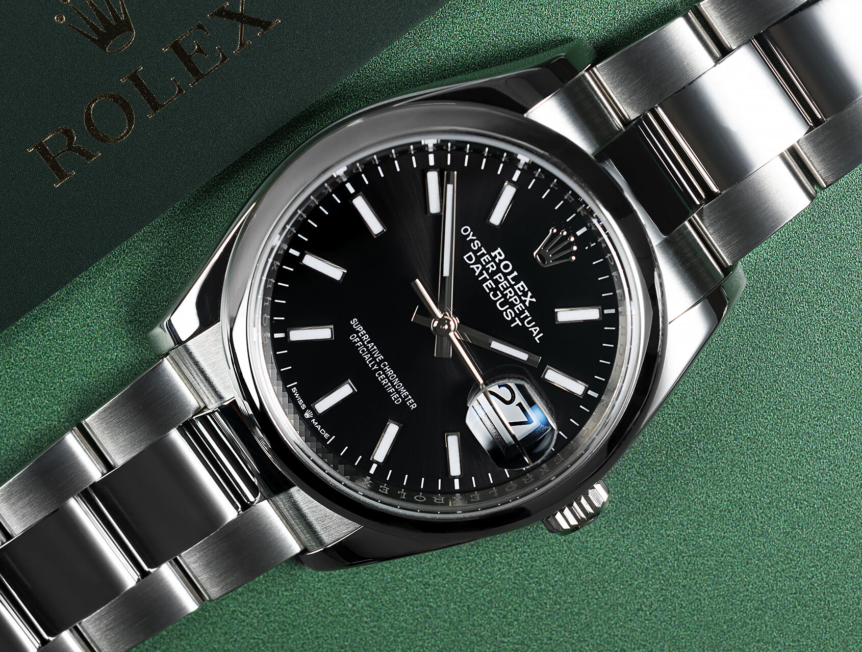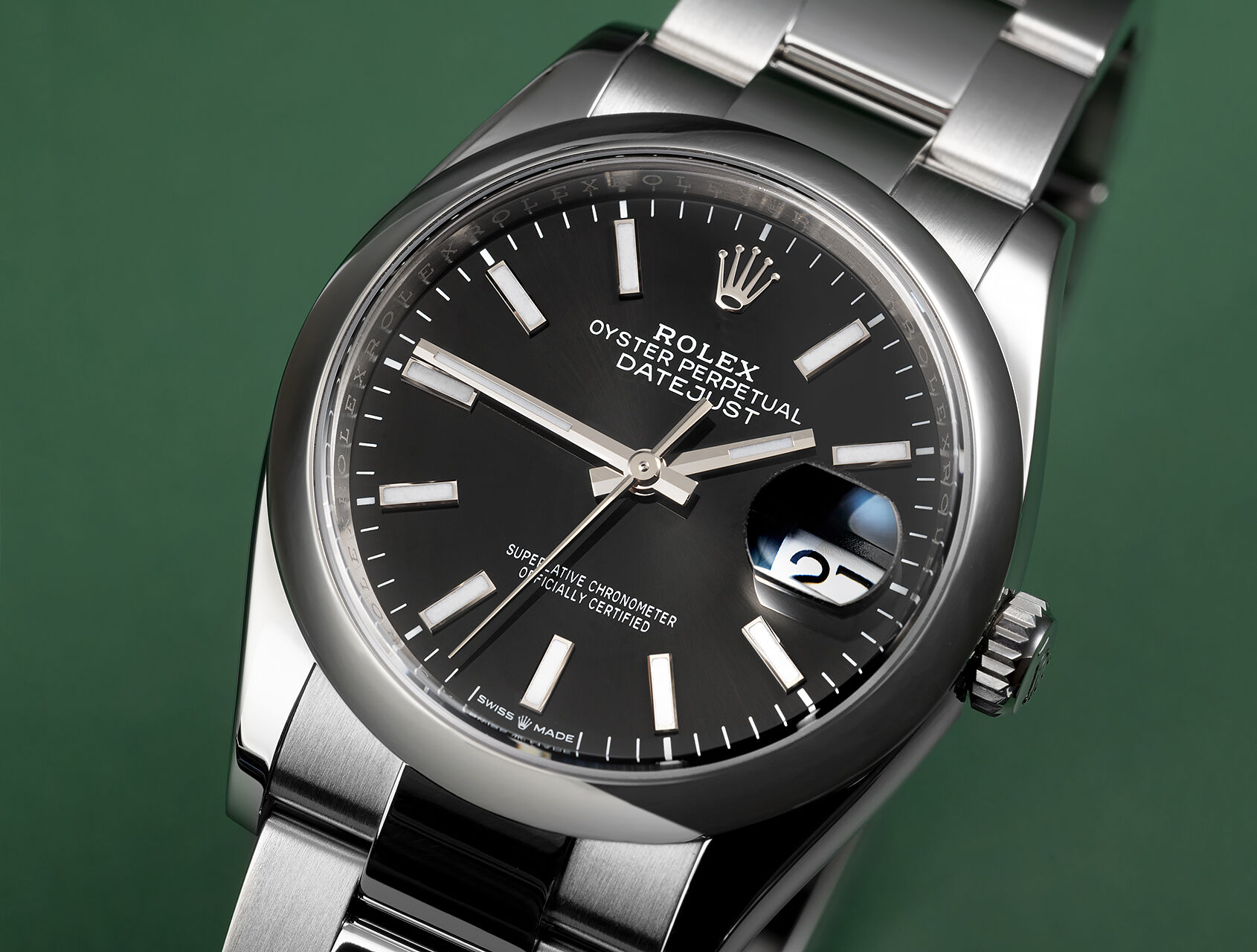 A perfect everyday watch in Rolex’s classic 36mm size, this Datejust features a bright black ‘soleil’ dial, smooth domed bezel and is fitted to the polished centre link Oyster bracelet with 5mm Easylink adjustment.Powered by Rolex latest self-winding calibre 3235 with improved 70-hr power reserve, waterproof to 100m.