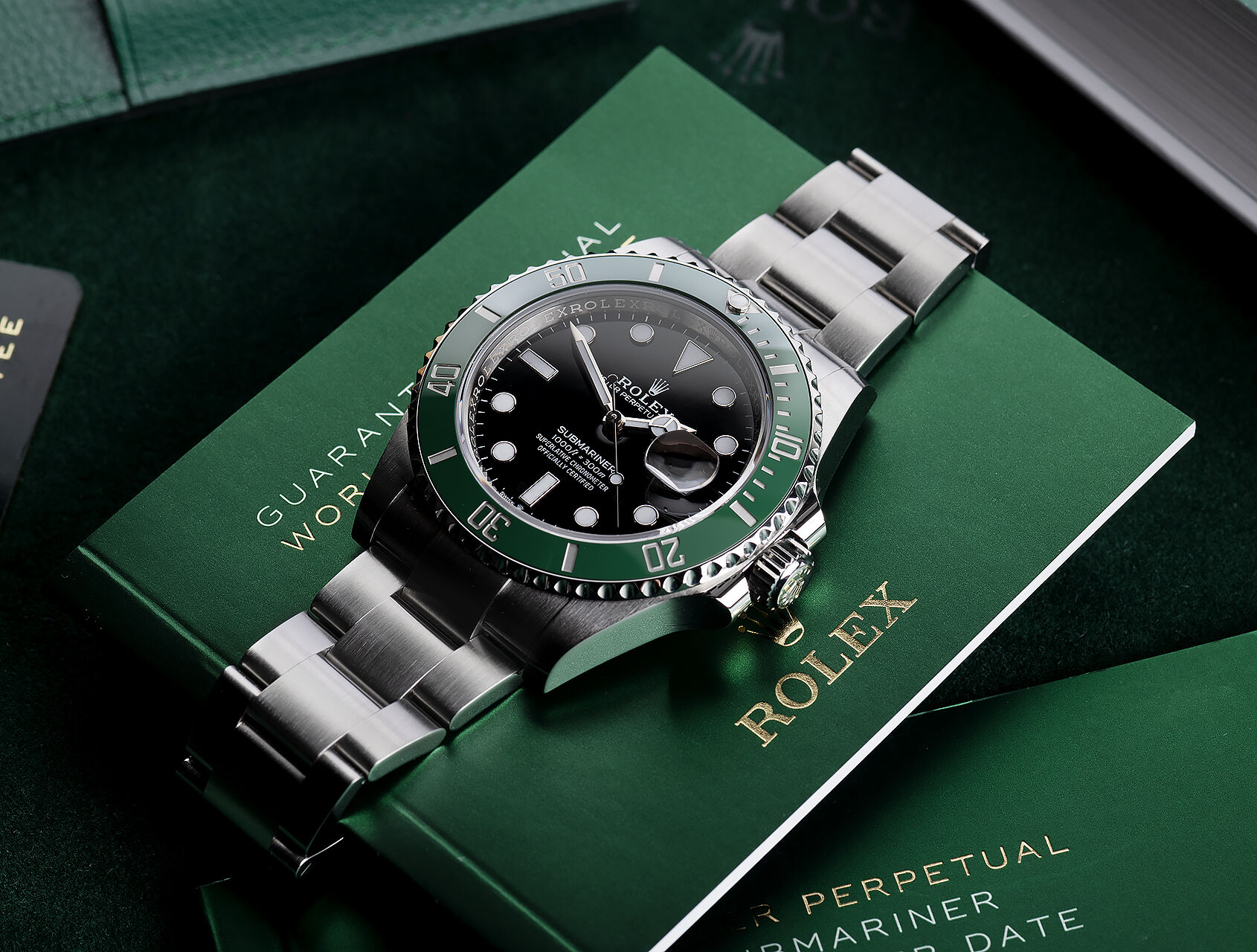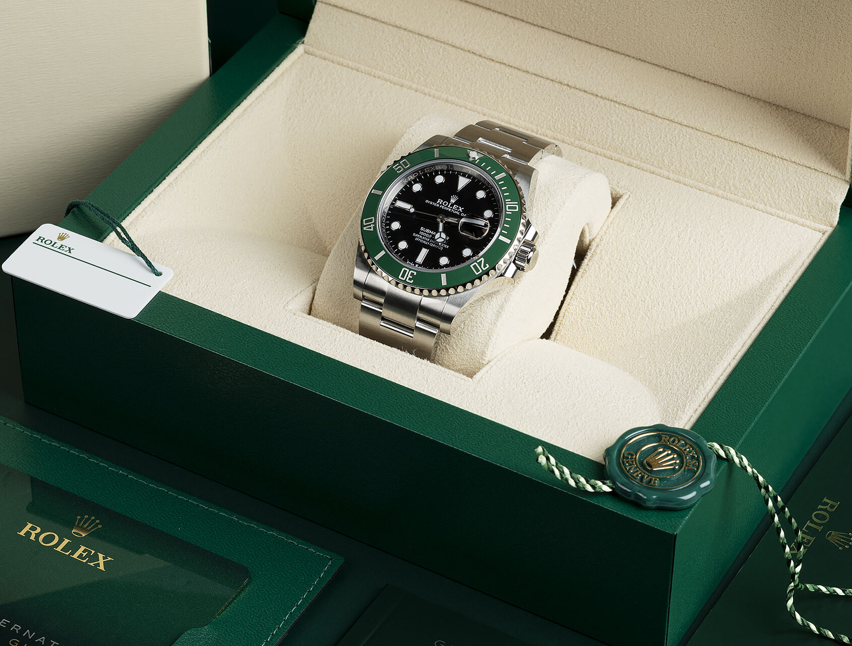 Already a solid investment, and now discontinued. This final-edition 2020 Rolex Submariner 116610LV Hulk is among the last ever to be supplied. 40mm stainless steel Oyster case, with green dial and large chromalight markings. This timepiece is water-resistant to 300m.