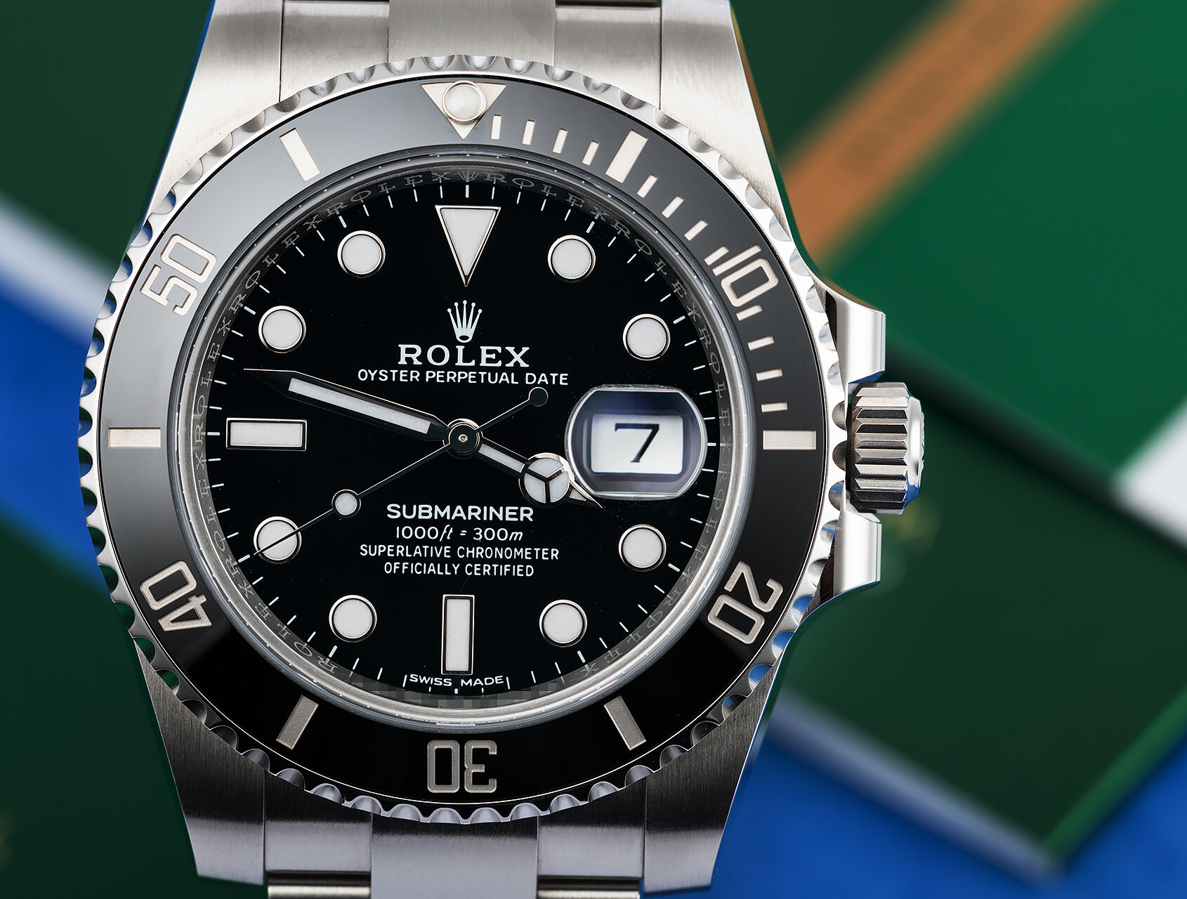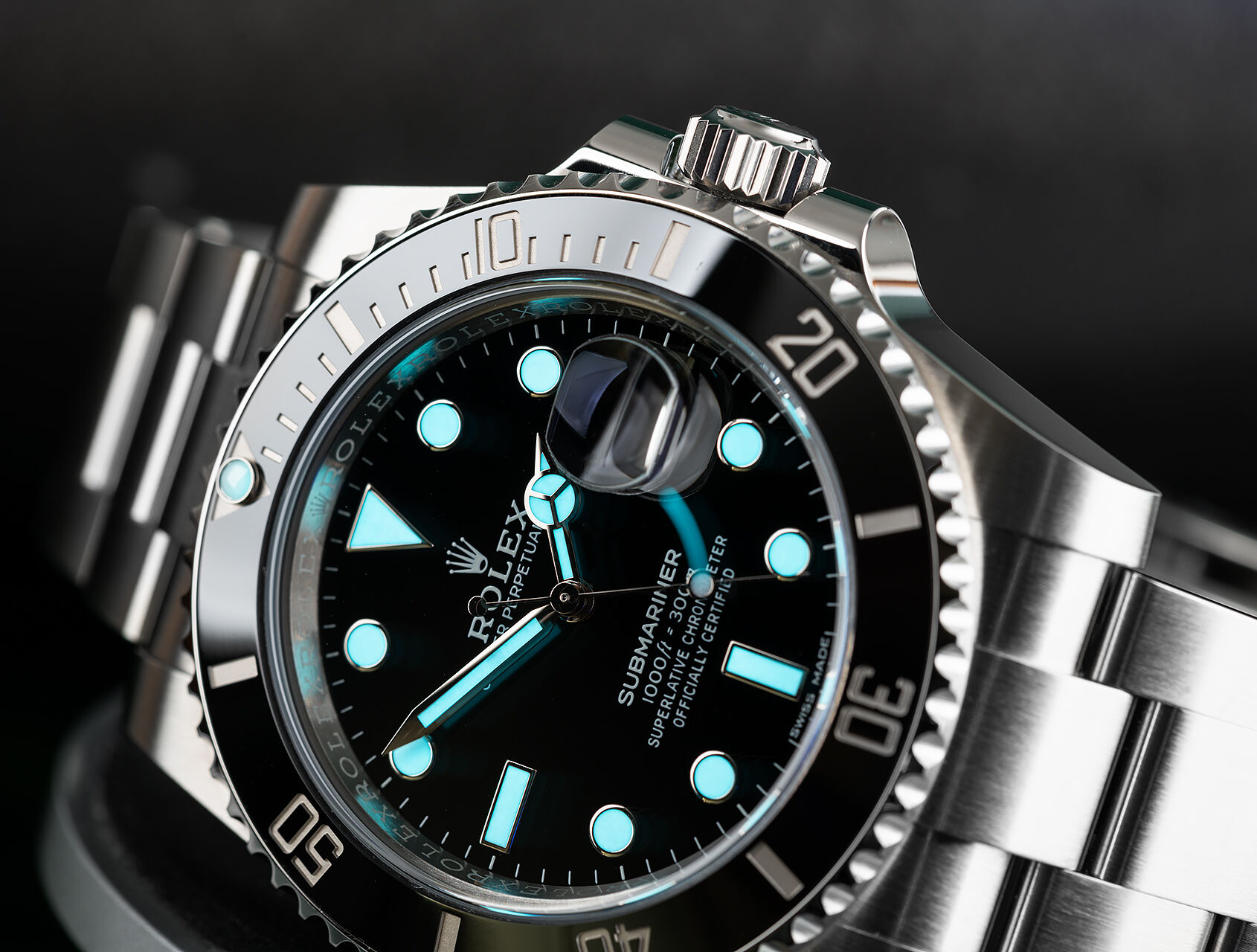 Waterproof to 300m, equipped with the high tech black Cerachrom divers bezel, blue glowing Chromalight lume and powered by the automatic Rolex calibre 3135 automatic movement.